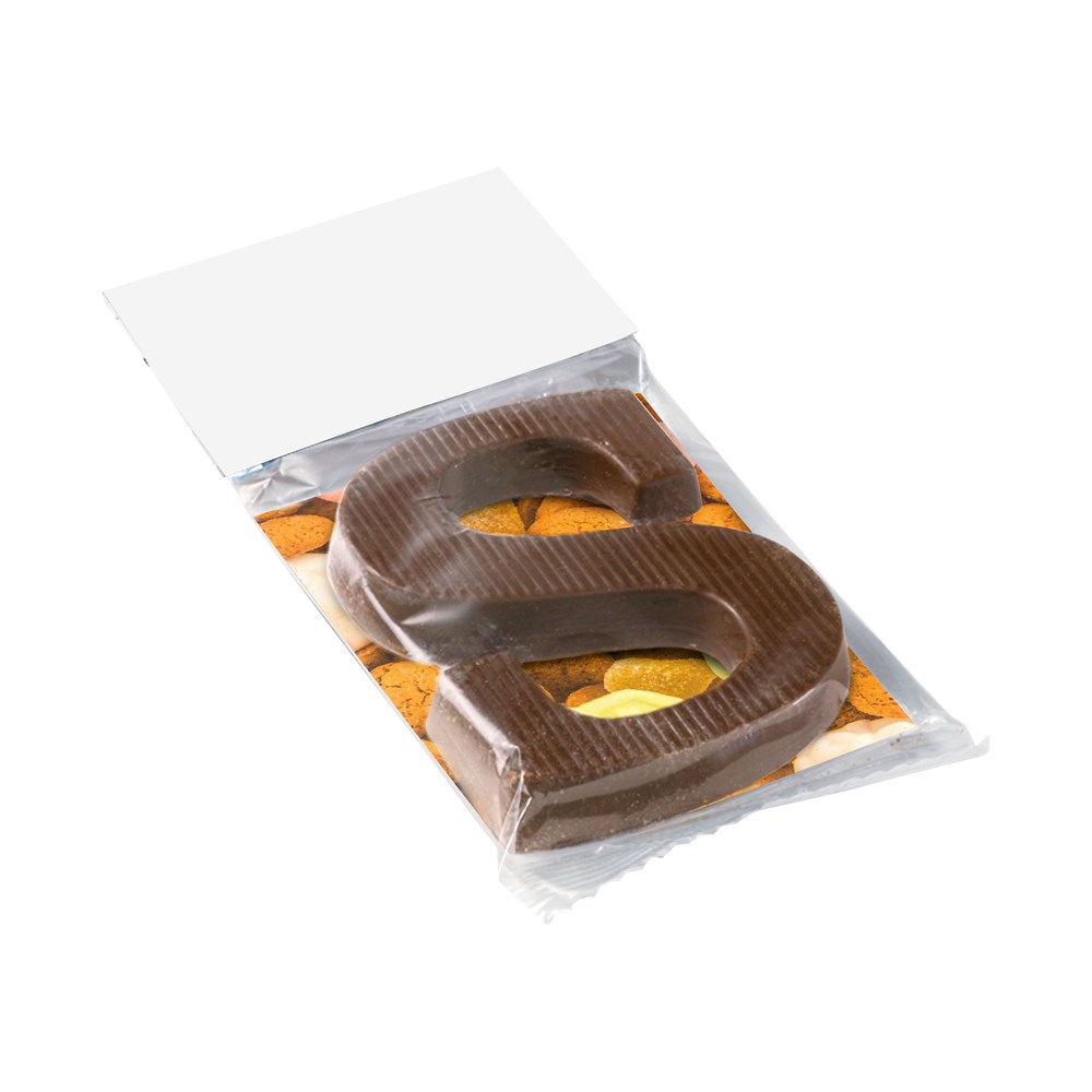 Transparant zakje met full colour kopkaartje gevuld met 1 melk chocoladeletter, ca. 40 gram