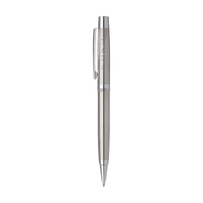 Blauwschrijvende RVS balpen met een chique combinatie van matstaal en hoogglans accenten. Met draaikliksysteem en solide handligging.