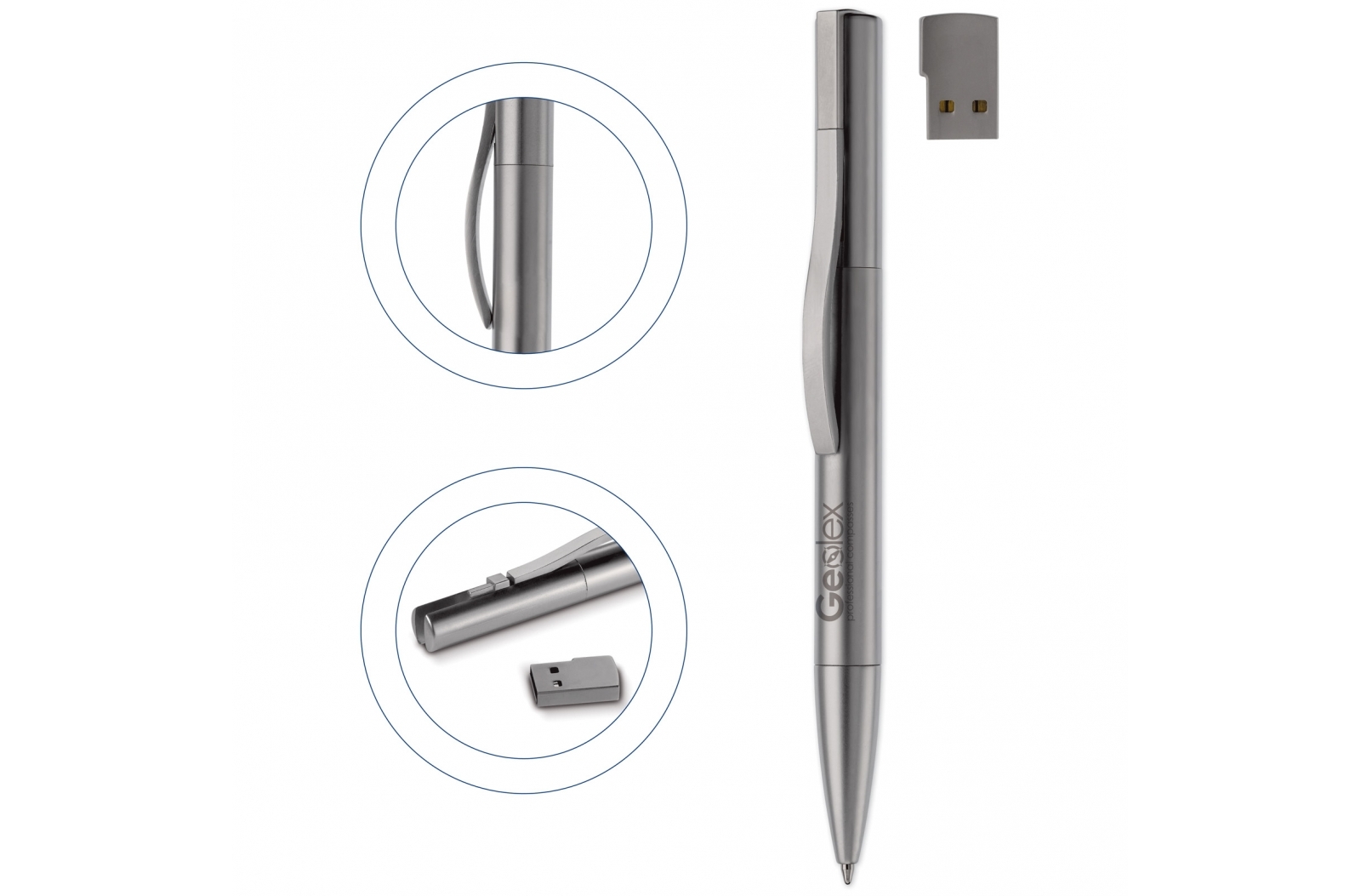 Metalen balpen met geïntegreerde USB 2.0 flash drive subtiel verwerkt in de bovenzijde van de balpen. Toppoint design. Inclusief een Europese blauwschrijvende metalen schrijfvulling. Prijzen zijn exclusief de wettelijk verplichte €0,50 thuiskopieheffing.