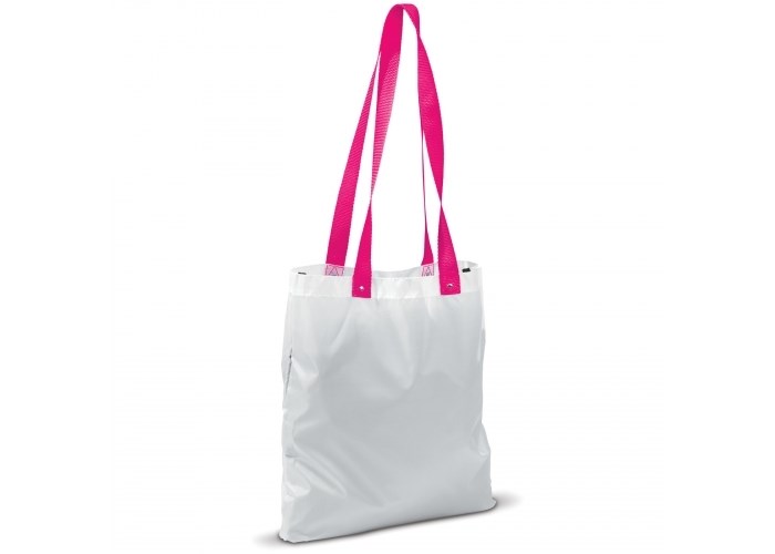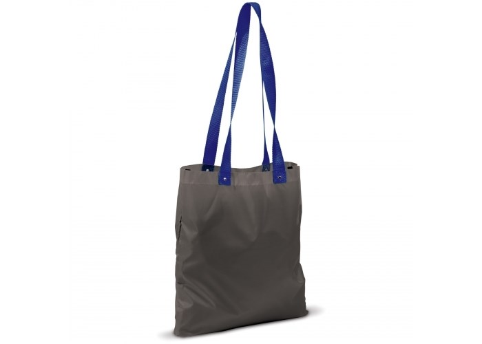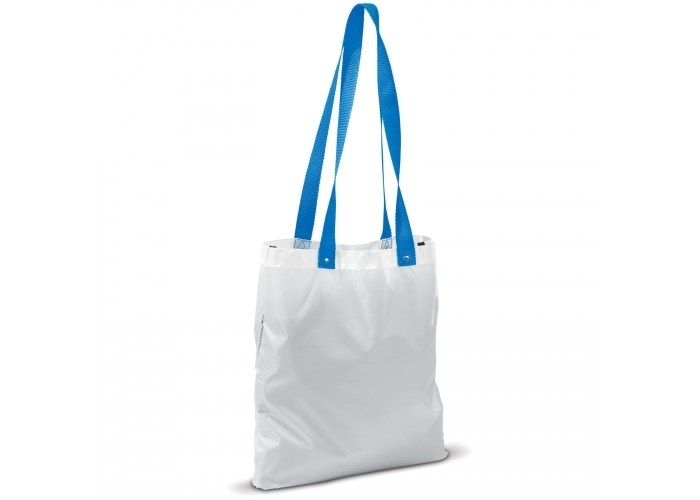 Polyester tas met opvallende, gekleurde geweven hengsels. Metalen buttons bij de aanhechting van de hengsels voor extra versteviging.