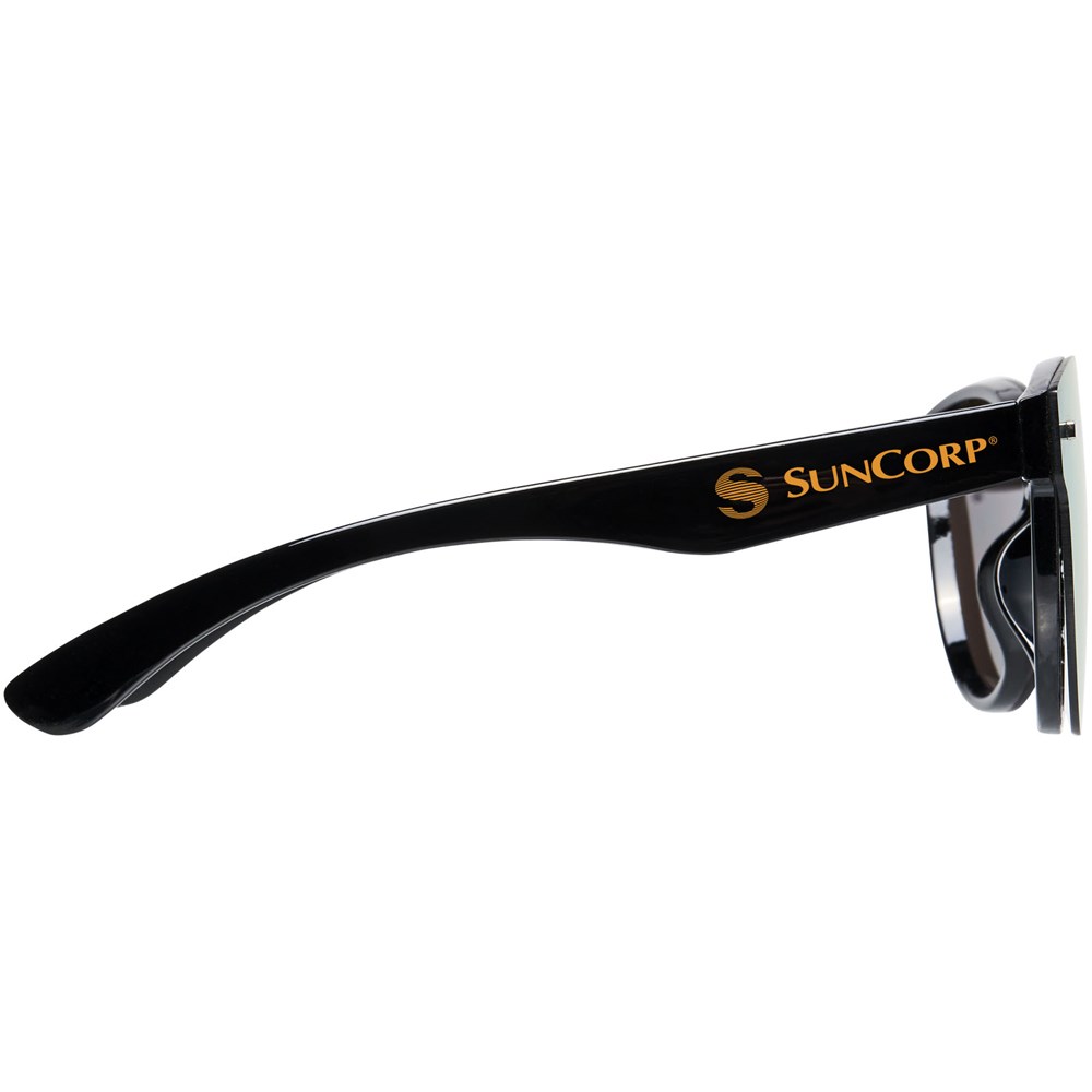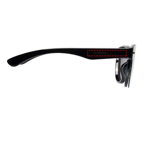 Shield zonnebril met trendy design en spiegelglazen. Voldoet aan EN ISO 12312-1 en UV-400, glazen zijn van klasse 3. Standaard komt de bedrukking op 1 pootje