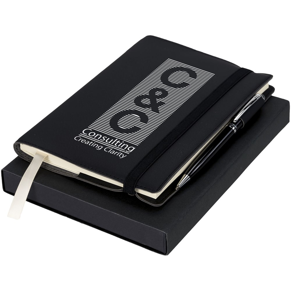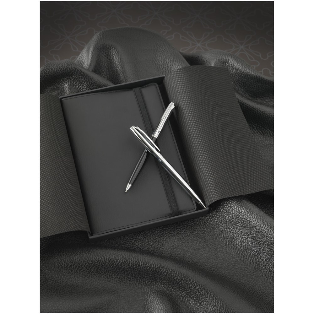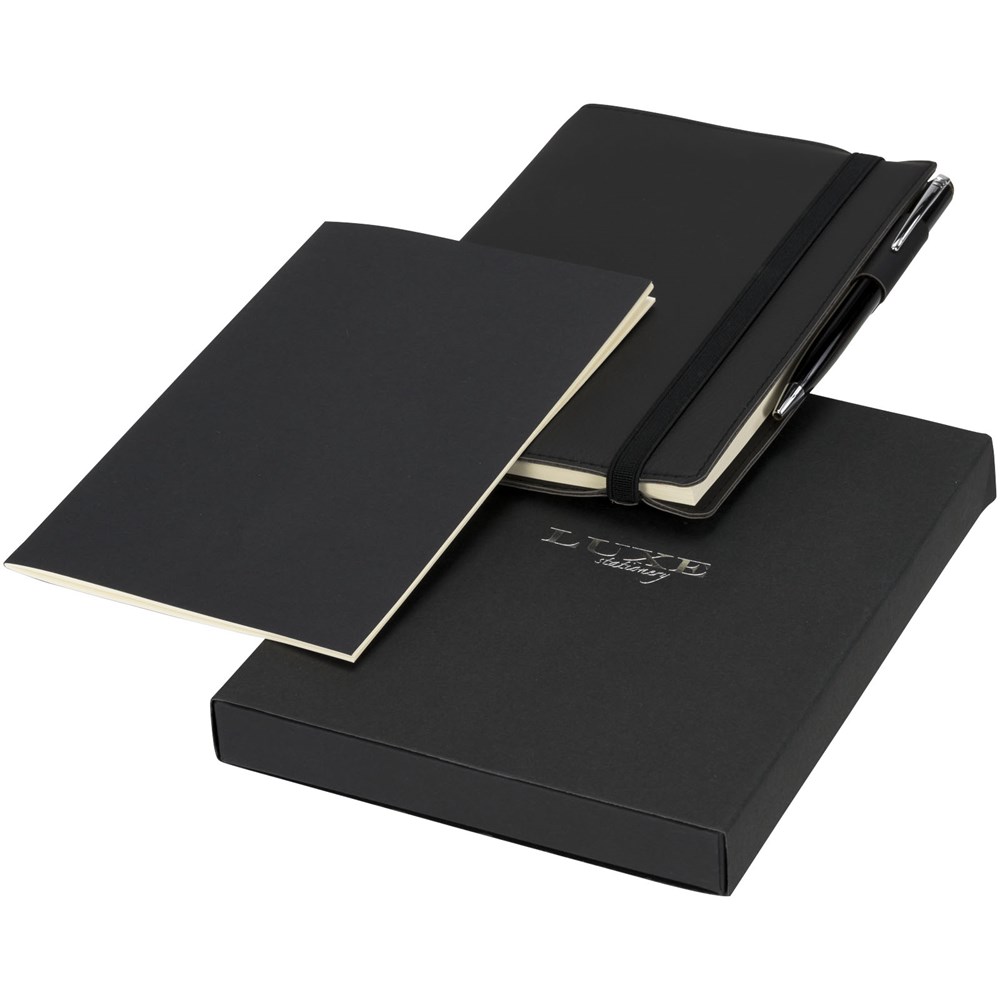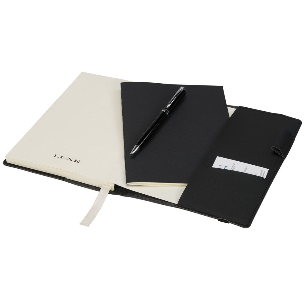 Notitieblok met exclusief design en flexibele omslag (80 bladen/80 g/m2 gelinieerd crème papier) met geïntegreerde penlus en insteekvak voor visitekaartje aan de binnenkant van de achteromslag. Een extra boekje is opgenomen voor het maken van afzonderlijke aantekeningen. Incl. balpen gezamenlijk verpakt in een ''LUXE'' geschenkverpakking.