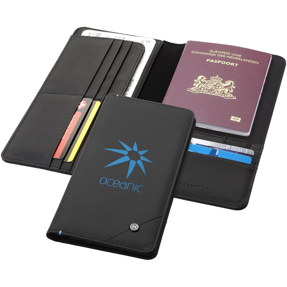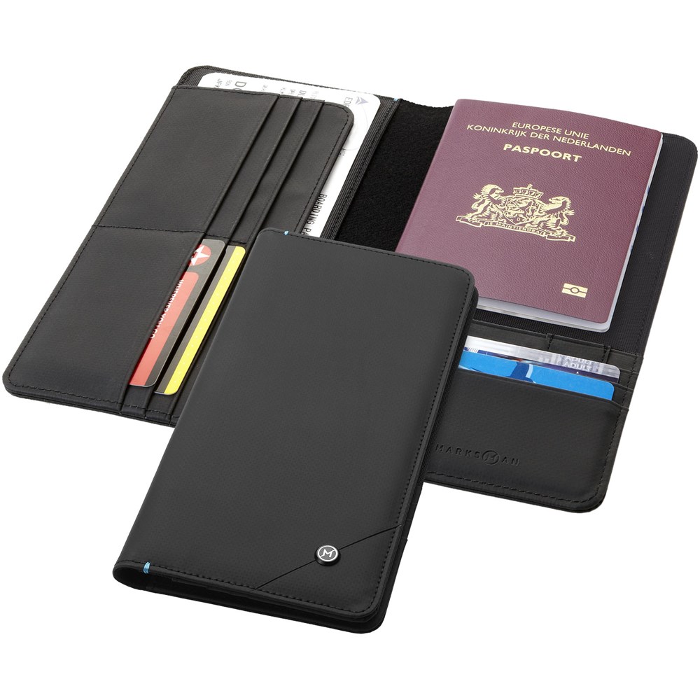 Creditcards, paspoorten en andere identiteitsbewijzen zijn vaak voorzien van RFID chips. Deze exclusief ontworpen reisportefeuille heeft een RFID-blokkerende binnenlaag die identiteitsdiefstal onmogelijk maakt. Tien hoesjes voor creditcards, twee grote steekvakken, paspoorthouder, pennenlus en een vak voor SIM-kaarten. Geleverd in Marksman geschenkverpakking. Accessoires niet inbegrepen.