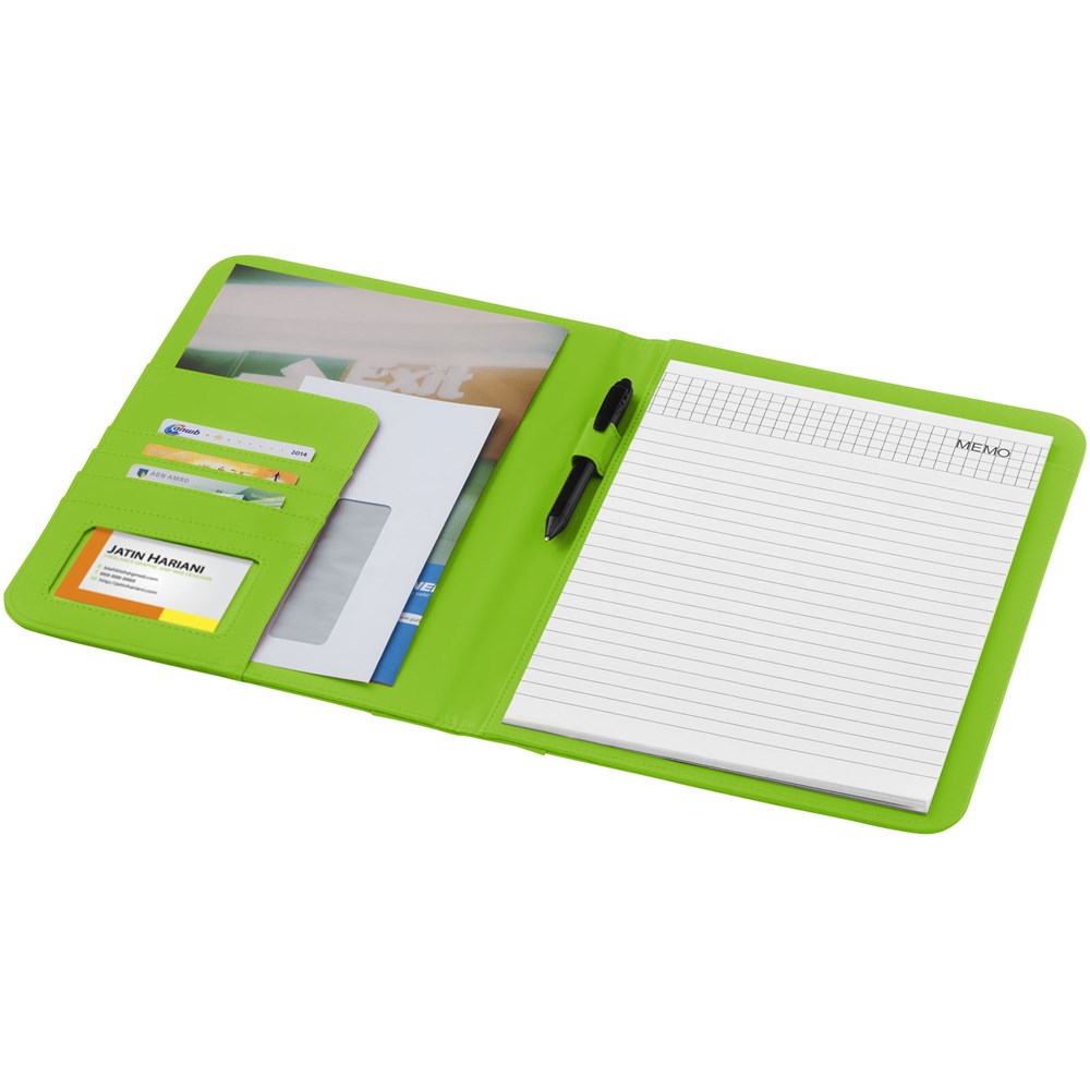 Portfolio A4 formaat met pennenlus, documentvakken en notitieblok met 20 pagina's gelinieerd papier. Pen en accessoires niet inbegrepen.