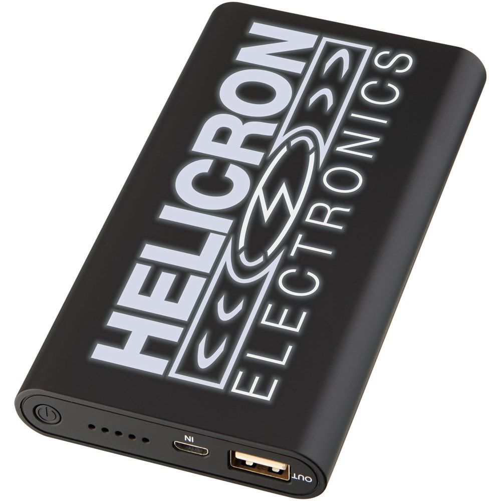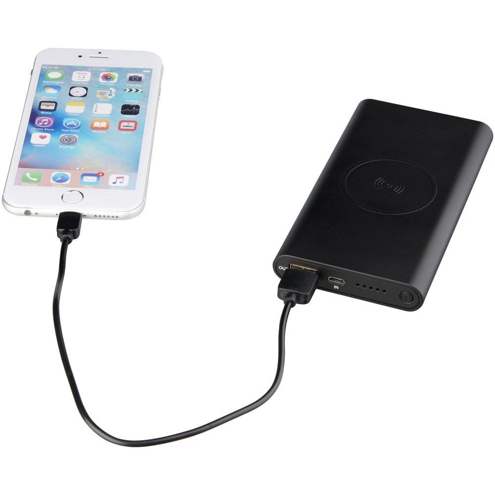 De Glisten 4000 mAh oplichtende draadloze powerbank heeft een oplaadbare lithium-polymeerbatterij die ook kan dienen als oplaadstation of standaard powerbank voor onderweg. Uitgangen: 5 V/2A. Ondersteunt draadloos opladen tot max. 1A voor apparaten die draadloos kunnen worden opgeladen. Om iPhones die vóór de iPhone 8 zijn uitgekomen op te laden met draadloze technologie, is een externe draadloze oplaadontvanger of ontvangerkast vereist. Dit apparaat werkt met elke smartphone of tablet die geen draadloze technologie heeft via de normale powerbankmogelijkheden. Bevat een 2-in-1 oplaadkabel die compatibel is met elk apparaat met een micropoort, en ook met iOS-telefoons. Hij werkt met de meeste kunststof telefoonhoesjes. Logo zal oplichten tijdens het opladen. Dit item moet worden gelaserd om de oplichtende functie te onthullen.