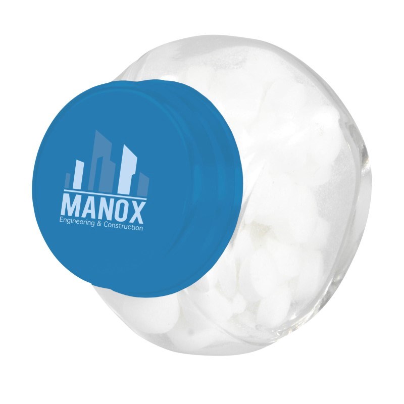 Glazen potje met ca. 30 g snoepjes. Keuze uit pepermunt, chocolade, jellybeans en hartjes.