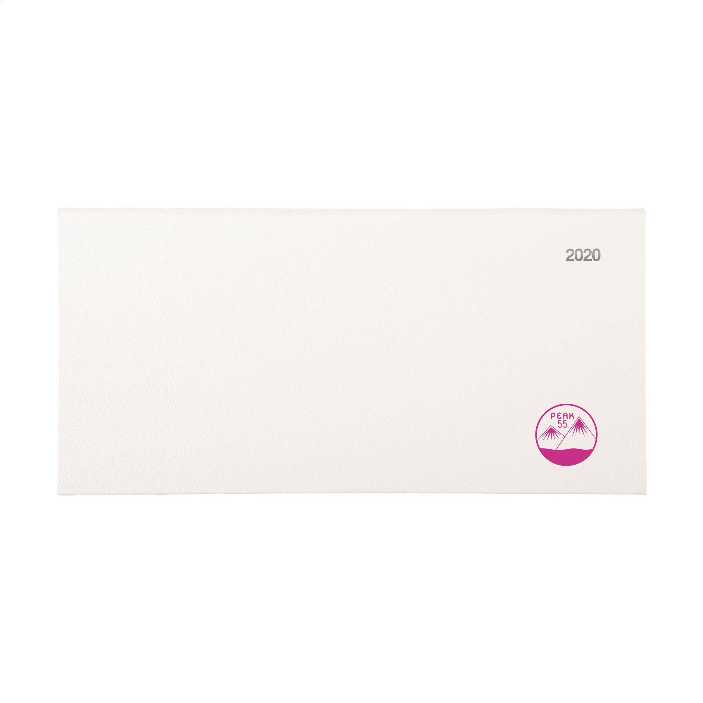 Zestalige zakagenda: NL, EN, F, D, I en ES. Imitatieleren, Balacron omslag met het jaartal op de voorzijde, 60 g. Wit schrijfpapier, tweekleurendruk, garengebonden, één week over twee pagina's, jaaroverzicht lopende jaar en eerste vier maanden volgende jaar, jaarkalender lopende jaar en volgende jaar, goud/zilver op snee. Omslag in zwart (3632.98) met goud op snee en jaartal in goud, andere kleuren omslagen met zilver op snee en jaartal in zilver. Gemaakt van papier met een FSC-Mix keurmerk.